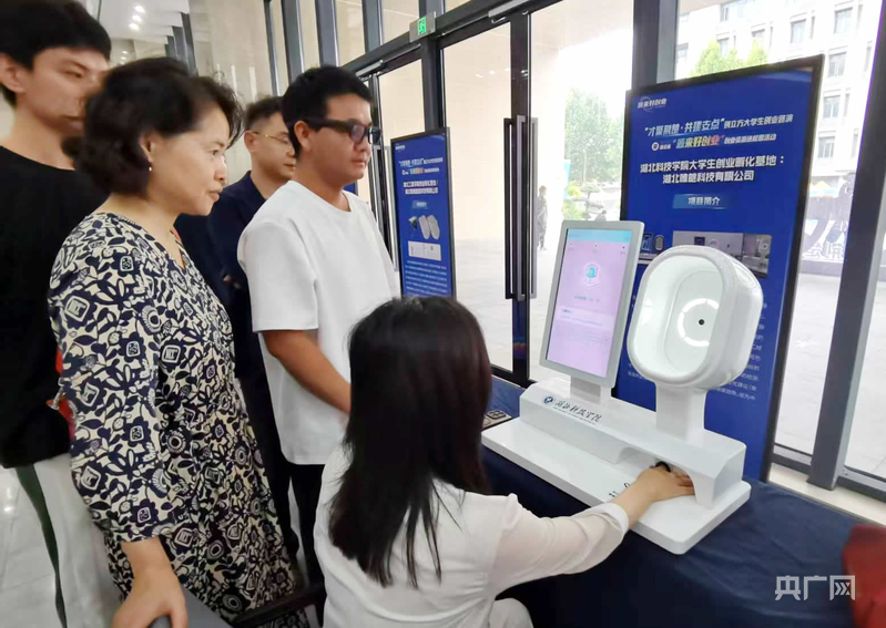 路演大厅外的创业项目集市同样人气高涨。在湖北科技学院大学生创业团队研发的“自助式中医检测终端”前,嘉宾们纷纷排队体验。据项目负责人介绍,该检测系统通过摄像头采集面部、舌部图像完成面诊、舌诊,搭配指尖脉动检测实现脉诊,再结合中医院海量临床诊断数据与大数据算法,可在一分钟内生成涵盖经络状态、体质类型、阴阳平衡、血氧水平、湿气程度等维度的中医健康报告,目前诊断准确率已超85%,设备已进入少量试生产阶段。