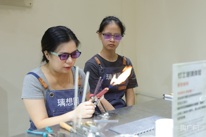 “璃想造梦坊”工作台上,蒋慧正给参与体验的客人示范操作(央广网发 周艳梅 摄)