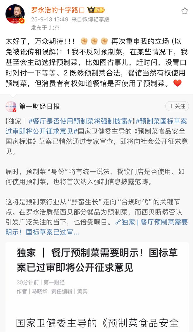 就像这次的西贝事件,目前的结果是国家卫健委主导的《预制菜食品安全国家标准》已经过审,即将向社会公开征求意见,这无疑是一件好事。罗永浩的炮轰行为,则是这件事最终落地的强大催化剂。