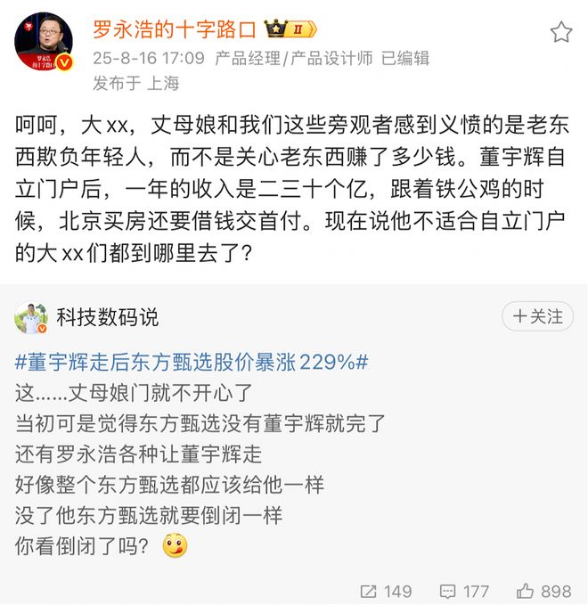 炮轰俞敏洪,力挺董宇辉,是站在弱者的一方,所谓“老板压榨有能力的年轻人”,说出了亿万社畜的心声;